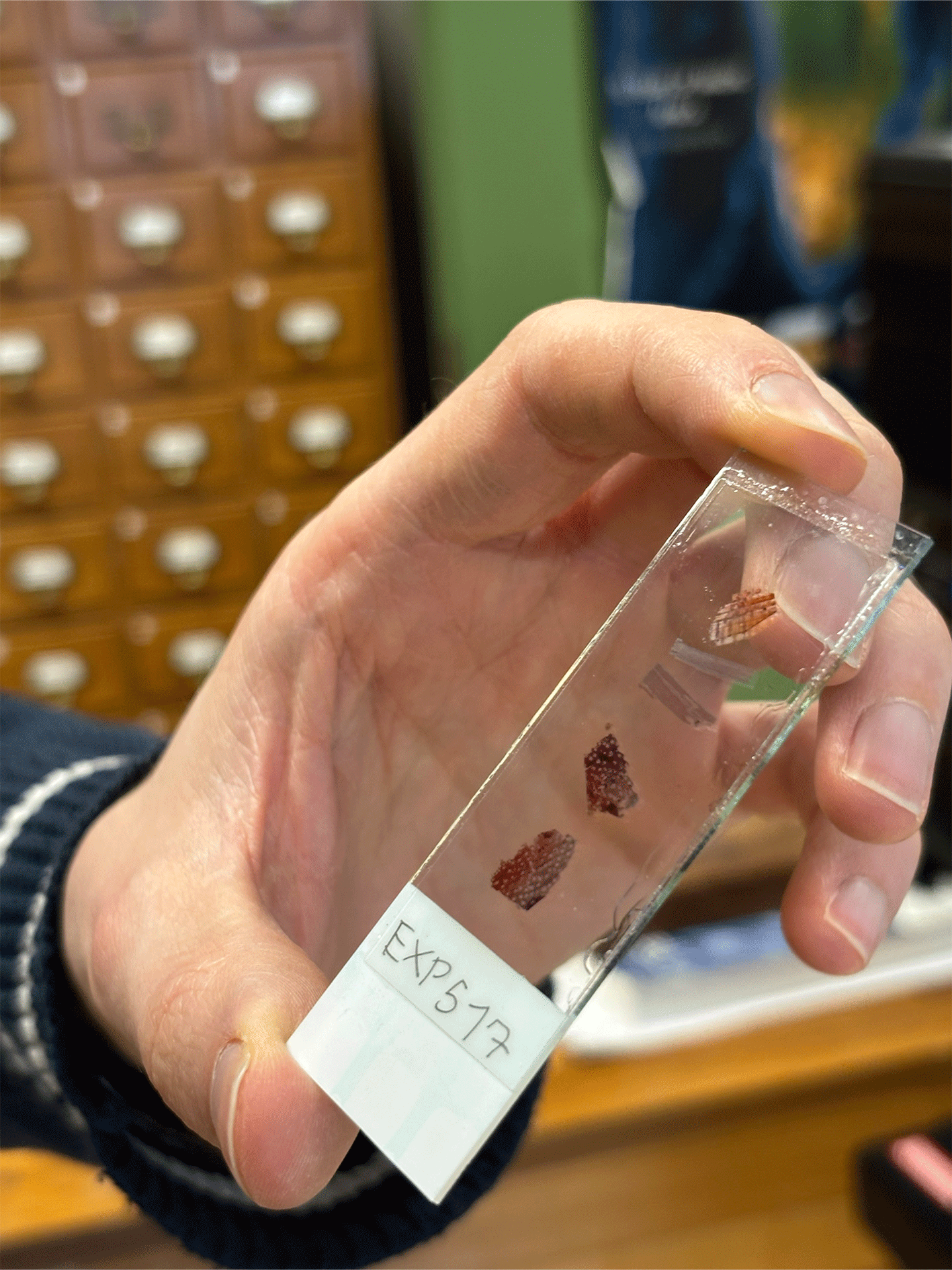 Michael analyseert een dunne sectie van het houtstaal EXP517 onder een microscoop.